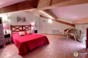 Il est aménagé sur 112m² au sol, mansardé, avec poutres et pierres apparentes. Il convient parfaitement aux familles pour 6 personnes ou moins pour les amateurs de grands espaces.